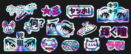 Y2k anime sticker set with holographic metal effect, pixel art characters and Japanese typography in iridescent gradients. Retro graphic icons with expressive eyes and stars for nostalgic design.
