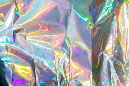 Abstract fashion rainbow holographic background in the style of the 80s. The texture of the foil with scratches and irregularities. Crumpled iridescent foil of real texture. High quality photo