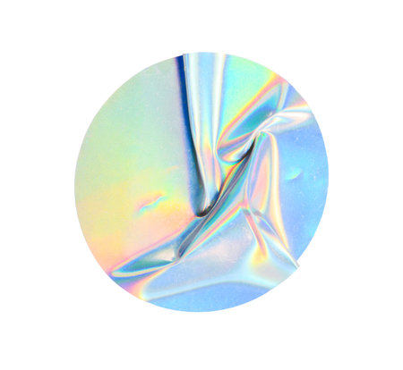 Round holographic duct foil sticker surface with wrinkles and colorful iridescent on background shimmer transparent