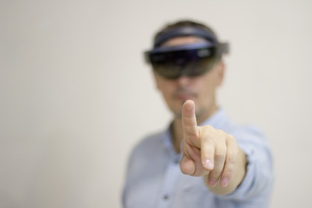 Portrait of young man with 3D virtual reality eye wear glasses hololens | Future sightseeing with hololens