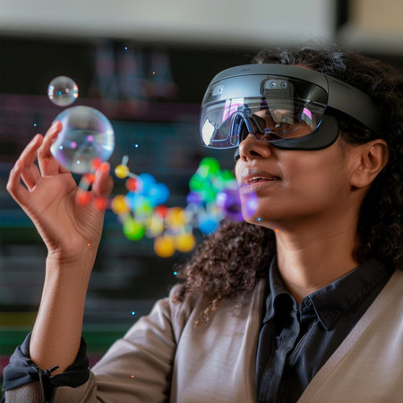 In a modern laboratory a researcher wearing augmented reality glasses observes and interacts with floating molecular structures enhancing her focus and understanding.