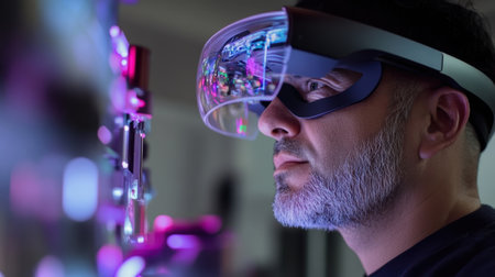Professional engineer wearing augmented reality headset viewing holographic digital interface in modern technology laboratory with blue ambient lighting.