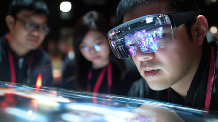 User engages with augmented reality through smart glasses, highlighting advanced visuals in a tech-focused setting, showcasing innovation and interaction.