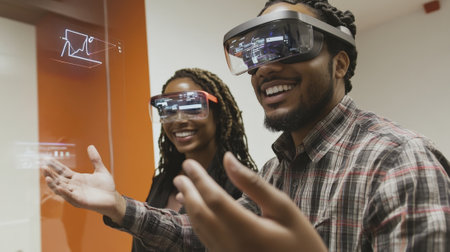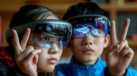 Two Young Students Immersed in Virtual Reality Using Augmented Reality Headsets for Education.