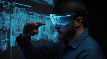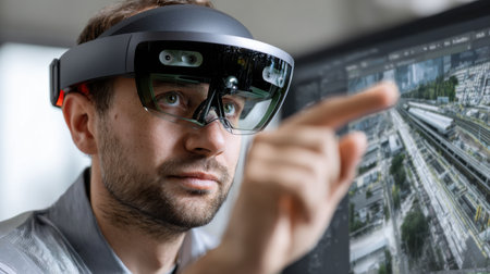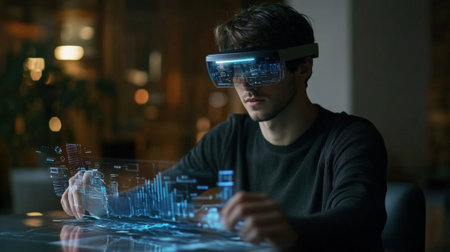 user explores virtual models of urban structures through augmented reality glasses merging digital visualization with real life elements in a contemporary workspace.