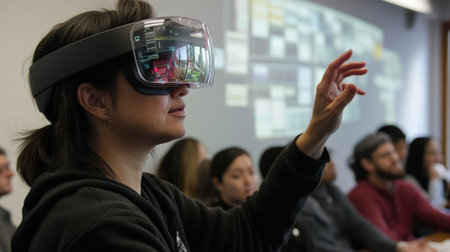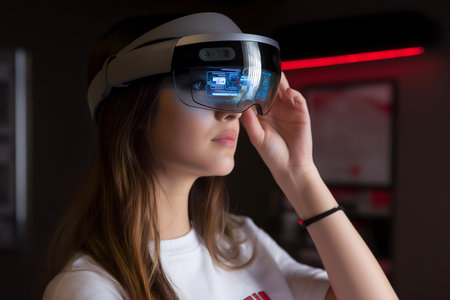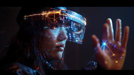 Young woman wearing advanced augmented reality headset with digital interface reflection exploring immersive virtual content. High quality photo