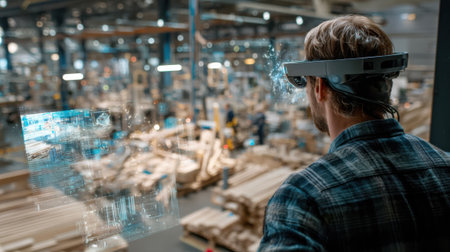 Medium shot focused on virtual inspection of millwork in a bustling factory setting using digital twin technology to detect discrepancies and streamline installation processes.