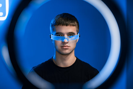 Portrait of a young man with neon cyber glasses.