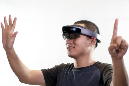 Young man with eye wear glasses hololens gesture action on white background. Mixed reality in future advanced technology concept.