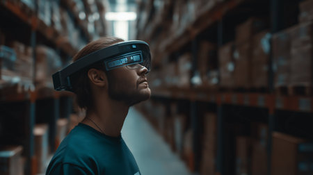 A person uses augmented reality glasses while navigating through shelves of a warehouse
