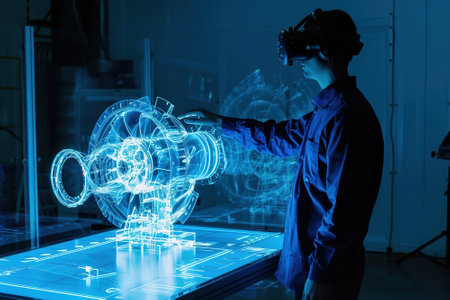 An innovative training session captured in a bright airy office where an instructor using augmented reality glasses demonstrates a complex workflow on a floating 3D model. Engaged participant