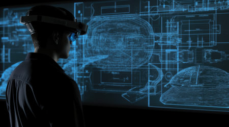 Engineer wearing augmented reality headset analyzing data on large screen