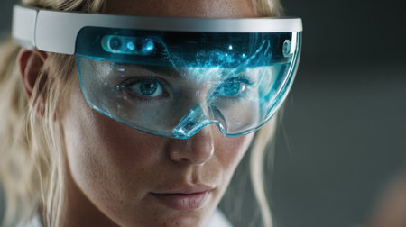 Tight, focused, shot capturing the face of a blonde woman intently looking forward while wearing sleek, white augmented reality goggles that project glowing blue digital information across the lenses.