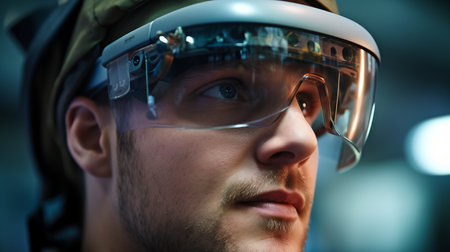 Augmented reality goggles showcase advanced technology in a busy industrial environment filled with machinery.