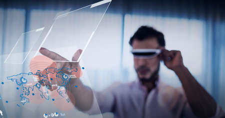 Man wearing futuristic glasses seeing virtual data and immersing into augmented reality