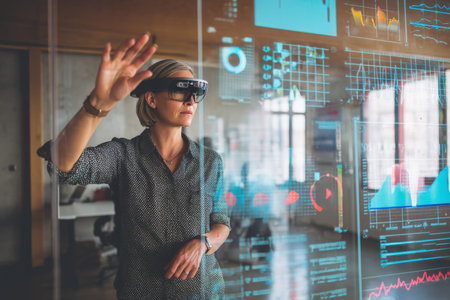 A middle-aged Caucasian woman interacts with digital graphs via AR glasses, navigating smart data in a cutting-edge tech office environment.