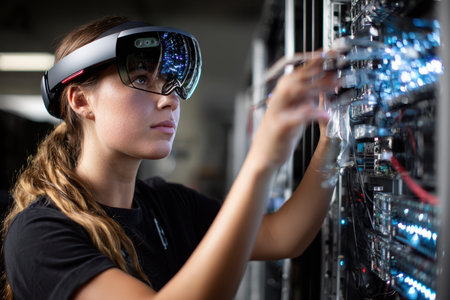 A woman in AR glasses inspects server equipment, enhancing her technical work in a modern facility.