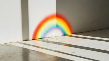 A rainbow is reflected in a window, creating a beautiful and colorful scene. The light is refracted, creating a sense of magic and wonder