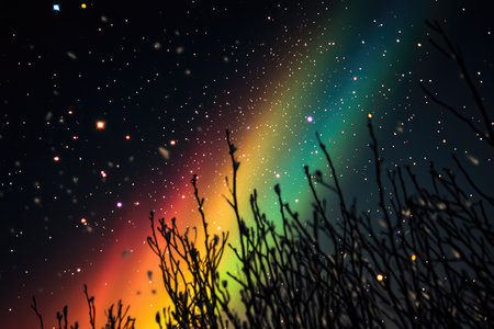 A low-angle shot of silhouetted branches against a colorful night sky with stars and aurora borealis.