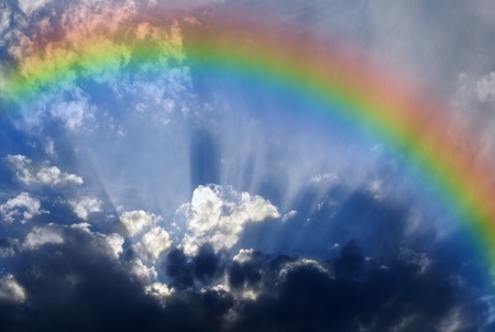 Rainbow in the sky. Beautiful background with colorful rainbow. Celestial phenomenon. The dispersion of light after rain.