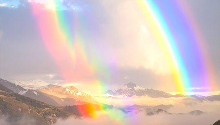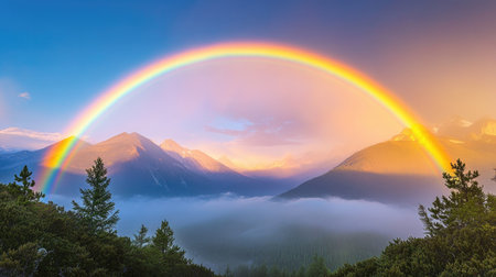 A stunning rainbow arcs gracefully over a breathtaking mountain landscape, illuminated by soft light during the golden hour, creating a serene natural scene.