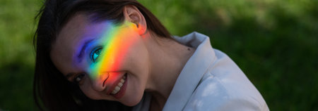 Portrait of caucasian woman with rainbow beam on her face outdoors