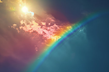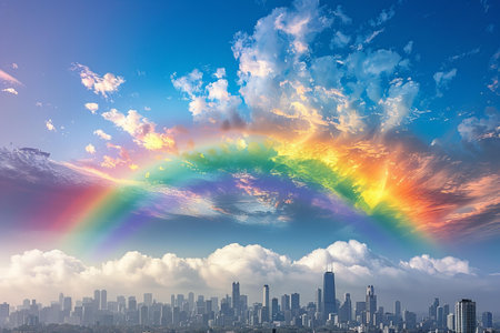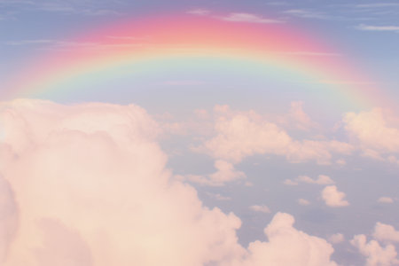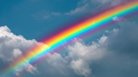 Digital image of rainbow arching across the sky, with white clouds below it in soft focus. the colors of the rainbow should be vivid and bright against the blue background, creating an enchanting scene.