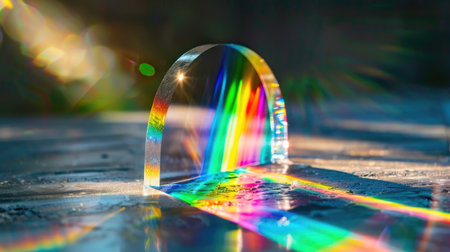A transparent prism placed on a surface creates a stunning display of light dispersion, producing a colorful spectrum in vibrant hues. The interplay of light and shadow enhances its beauty.