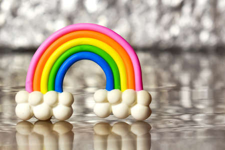 Toy rainbow on a silver background. Bright candy in the form of a rainbow with taxes close-up on a light mottled background. Space for text, greeting card.