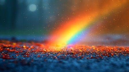 A vibrant rainbow spectrum of light is refracted through a prism, creating colorful bands on a textured, sparkling surface.