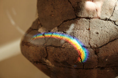 Rainbow Light Spectrum on Cracked Ancient Pottery. Close-up emphasizing the texture of the artifact and the colorful light phenomenon. Conceptual image representing the beauty found in unexpected places and times.