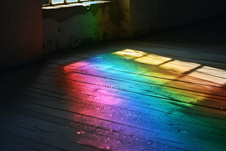 This image captures a vibrant rainbow light projection across a wooden floor, creating an enchanting atmosphere filled with color and warmth.