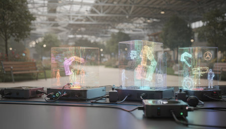 Transparent digital interface panels display abstract geometric wireframe graphics, arranged in a futuristic layout.