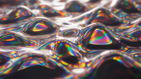A close-up of an iridescent liquid surface with dynamic ripples reflecting a vibrant spectrum of rainbow colors.