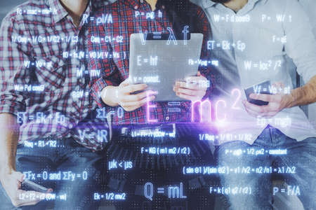 Double exposure of formulas hologram drawing and man and woman working together holding and using a mobile device. Education concept