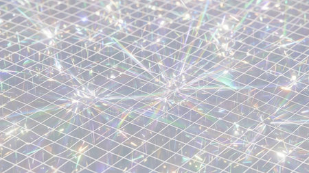 A close-up view of a sparkling diamond grid with vibrant rainbow refractions and light flares, creating an ethereal and luminous effect on a white background.