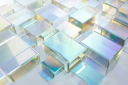 A sparkling, holographic abstract composition featuring angled strips with iridescent and glittery surfaces