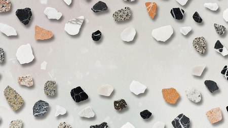 A light gray terrazzo surface with various colorful stone fragments scattered across it, creating a decorative pattern.