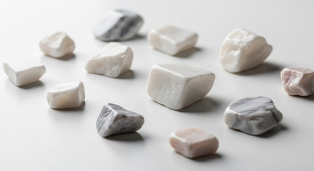 A collection of smooth, polished stones in various shades of white and gray arranged on a white surface.