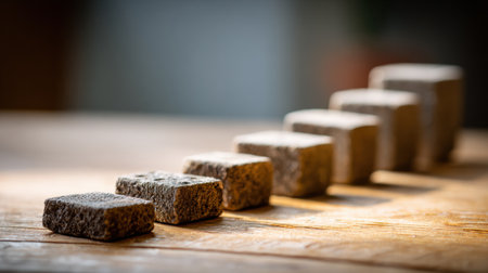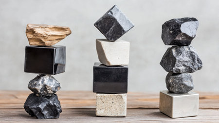 A captivating still life featuring balanced rock formations combining natural stones and architectural cubes, set on a wooden surface, emphasizing harmony and design.