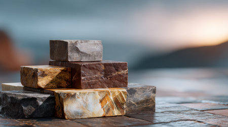 Stone blocks are stacked to create a systems concept background. The scene shows a smooth surface with soft lighting at sunset.