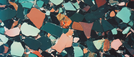 Highly polished terrazzo surface with rosy, black, and green stone fragments, artistic and contemporary
