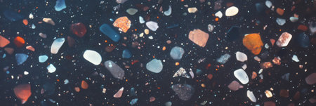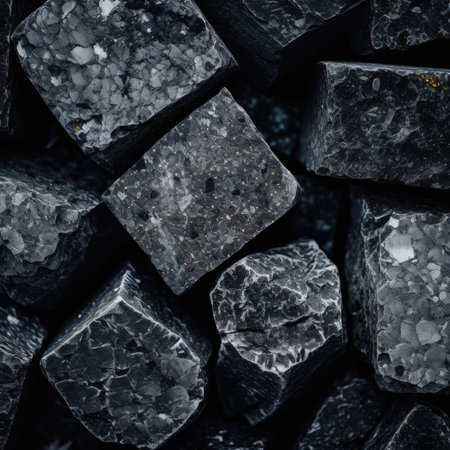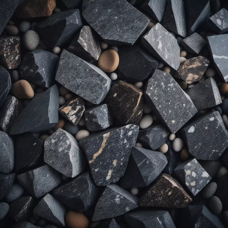 Intricate patterns of dark granite chips, illuminated by subtle lighting that creates a calm and elegant atmosphere. The black crushed mineral sparkles. Bokeh or drops. Generative AI.