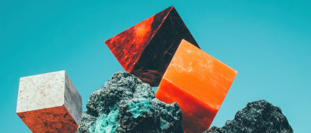 Four granite cubes with different textures and colors sit on a stone surface. Clear details and vibrant color...