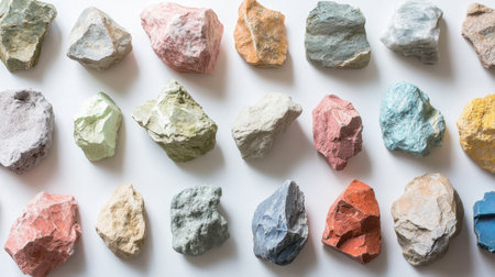 A vibrant collection of colorful natural rocks arranged neatly on a white surface, showcasing unique textures and hues perfect for artistic projects.