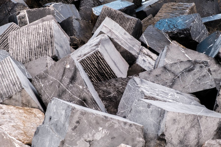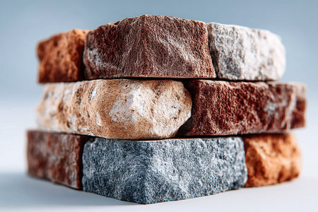 Marble blocks in various colors and patterns, arranged in a neat stack on a smooth surface. No people, copy space
