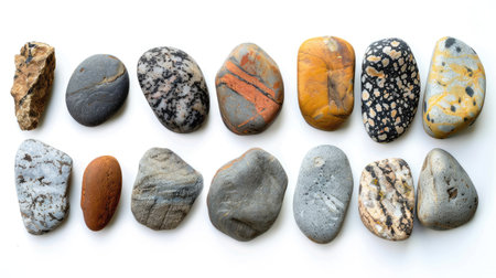 Different types of rocks arranged neatly, isolated on white background