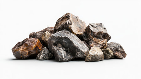 A simple isolated pile of rocks showcasing diverse textures and colors on a pristine white background. Ideal for nature and design themes.