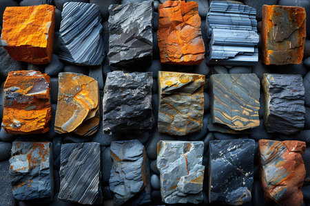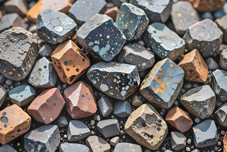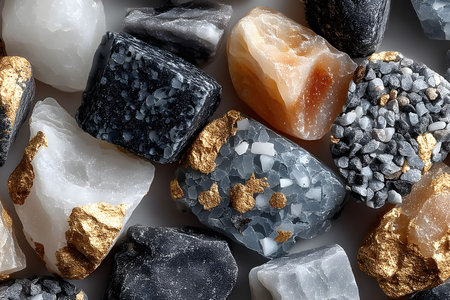 Close-up of various minerals showcasing a mix of textures and colors, including black, white, and orange stones with striking gold highlights. ideal for educational and decorative purposes, reflecting geological beauty. Generative AI