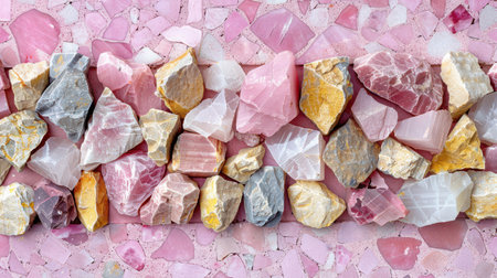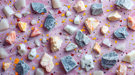 Elegant terrazzo pattern with pastel pink base and decorative mineral chips in soft neutral hues